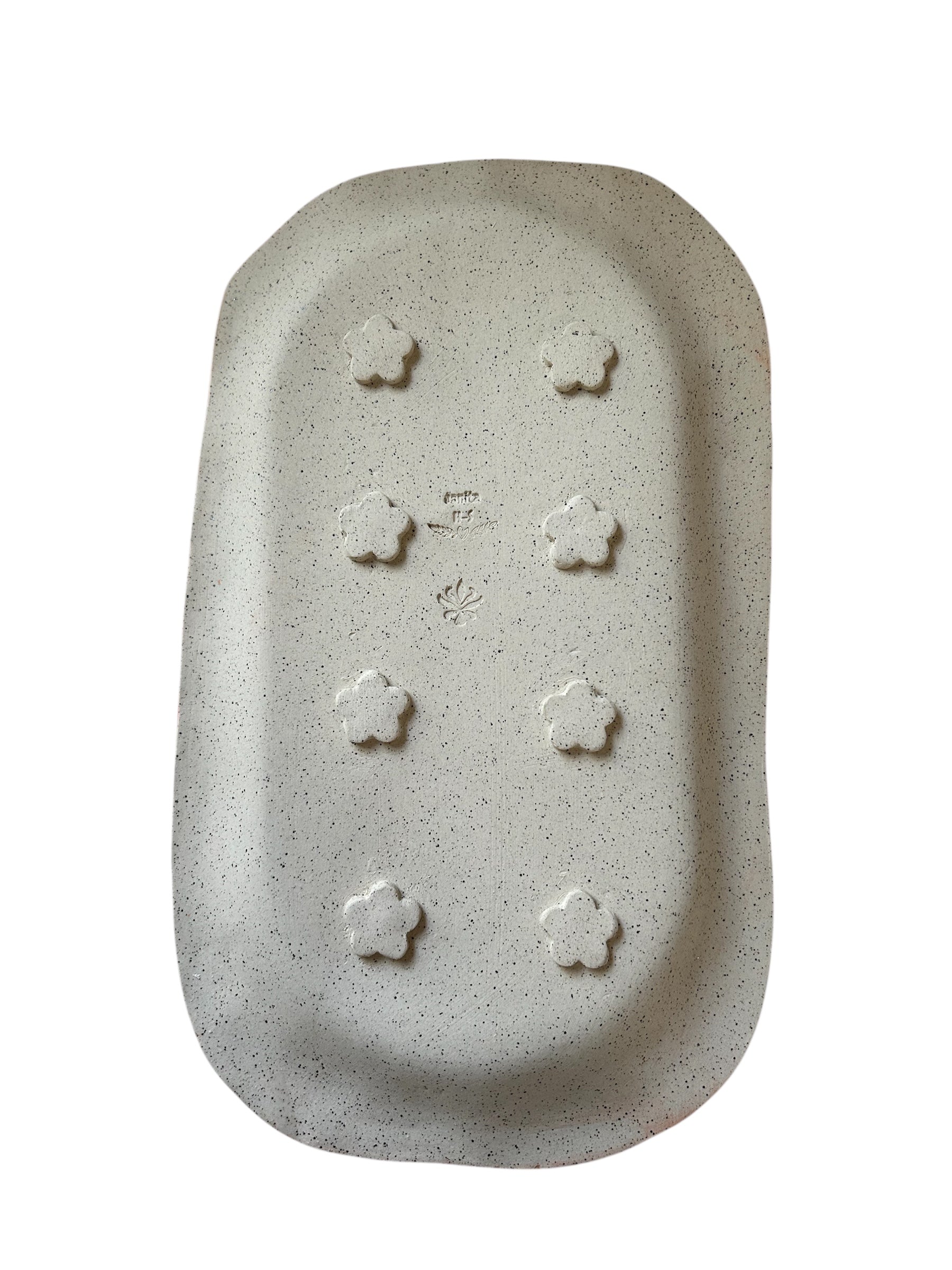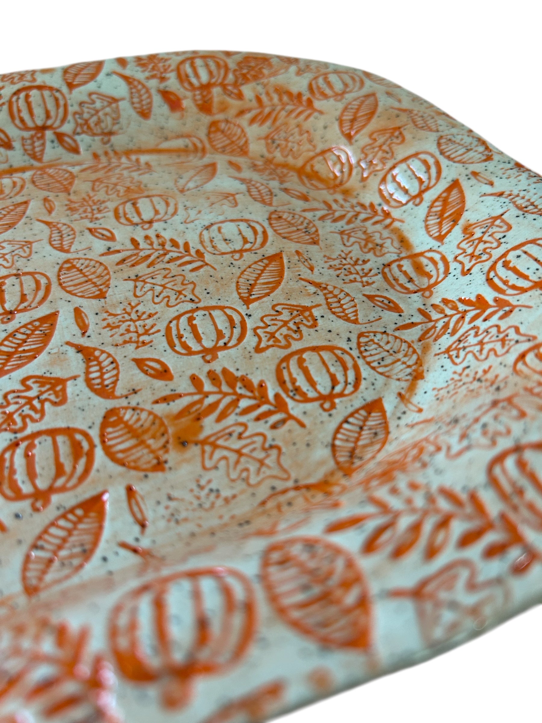 Large textured and rounded rectangular tray/plate decorated with fall pumpkins and oak leaves covered in food-safe autumn orange underglaze and clear glaze. Food, dishwasher, and microwave safe. Speckled white stoneware clay was used.