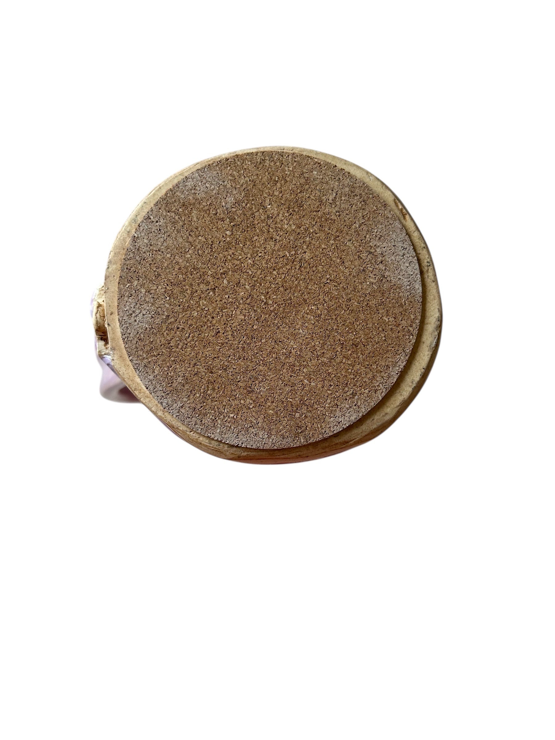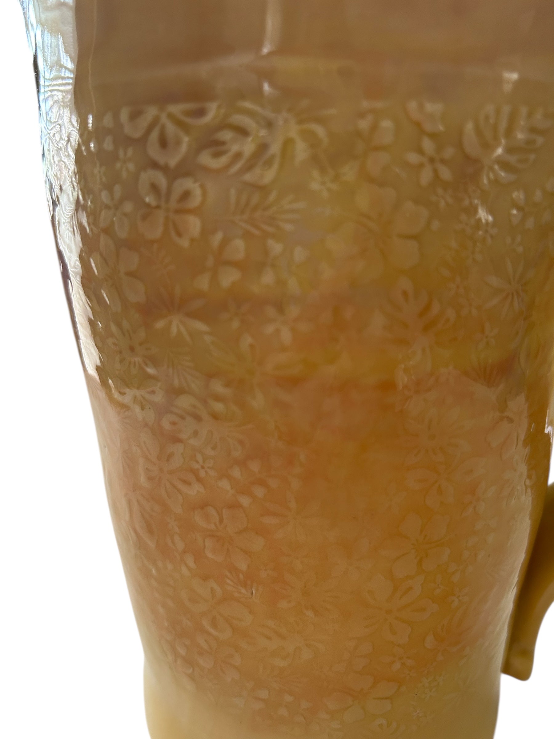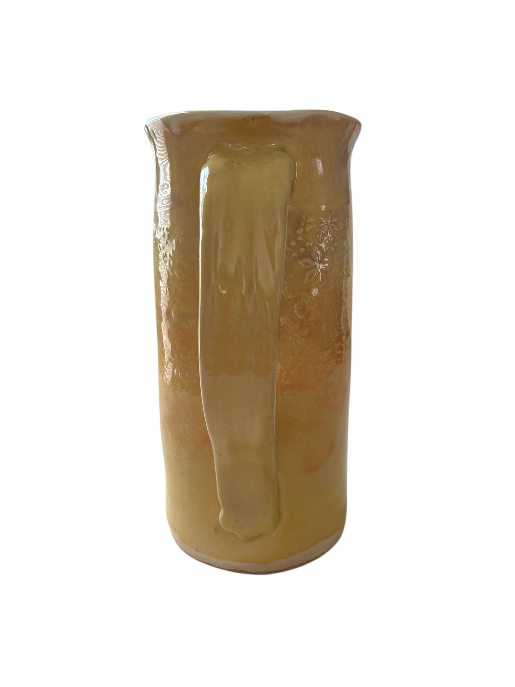 Throated pitcher with floral texture glazed in the colors of the desert sunset. Throat below spout helps control the flow of liquid, so there is less dripping. Holds approximately 48 ounces of liquid (without ice). Slab construction. Natural cork on bottom.