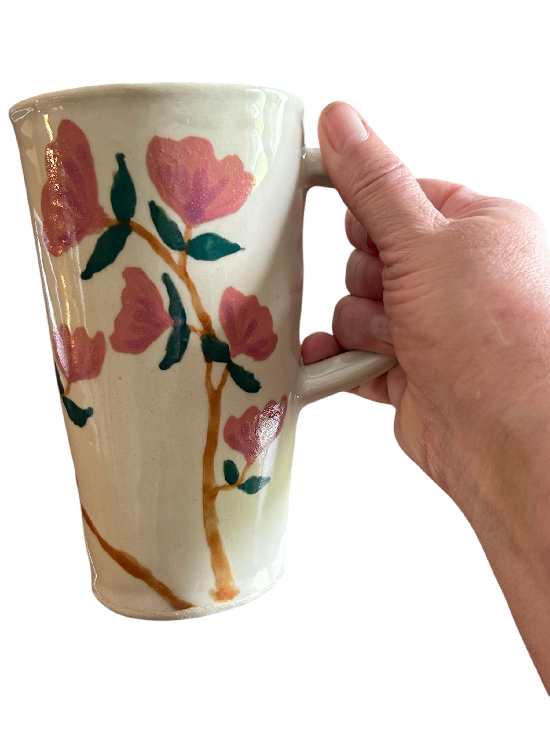 Handpainted travel mug with large cardinal and pink and lilac stylized flowers. Designed to fit into your car holder. Food, microwave, and dishwasher safe.