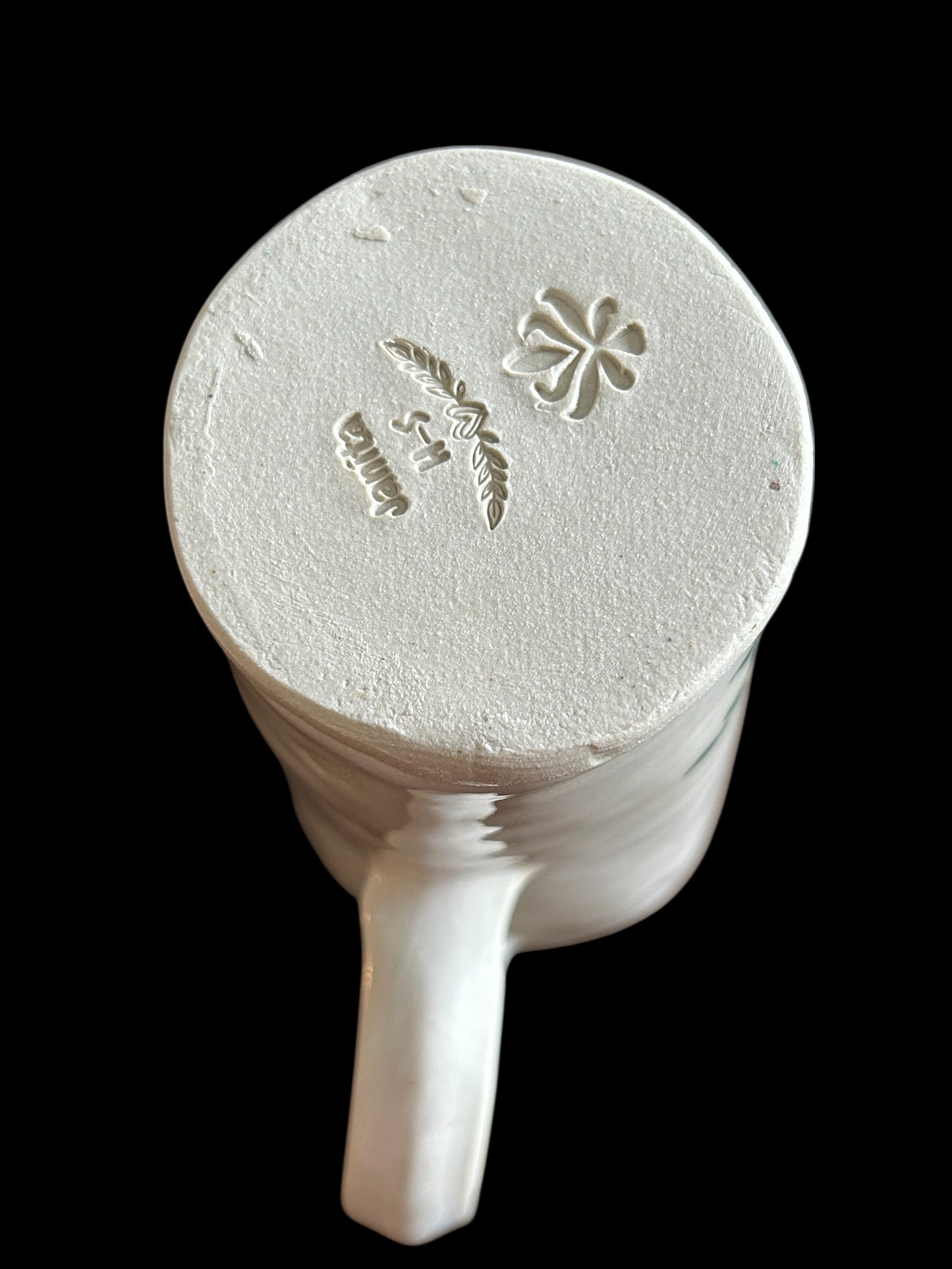Handpainted travel mug with red cardinals and stylized tree branches. Designed to fit into your car holder. Engineered for the left-handed customer. Food, microwave, and dishwasher safe.