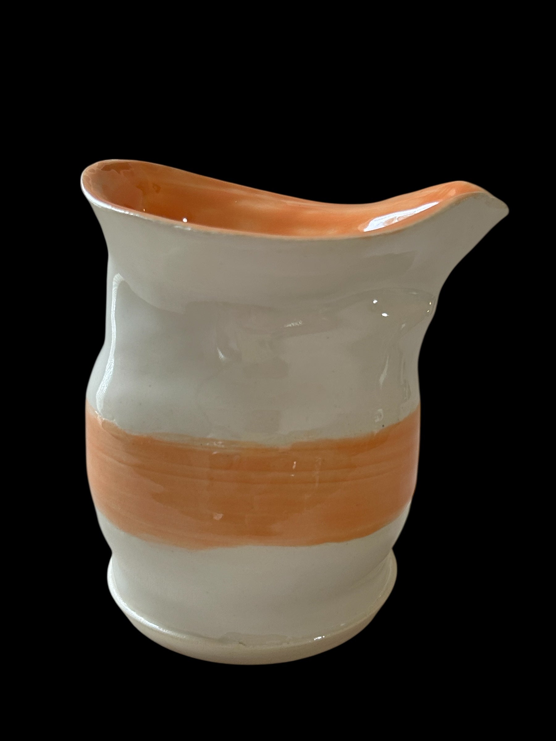 Wheel-thrown creamer or gravy pourer glazed in white and tangerine orange with a striped design. Built-in handle by holding below the wide rim.