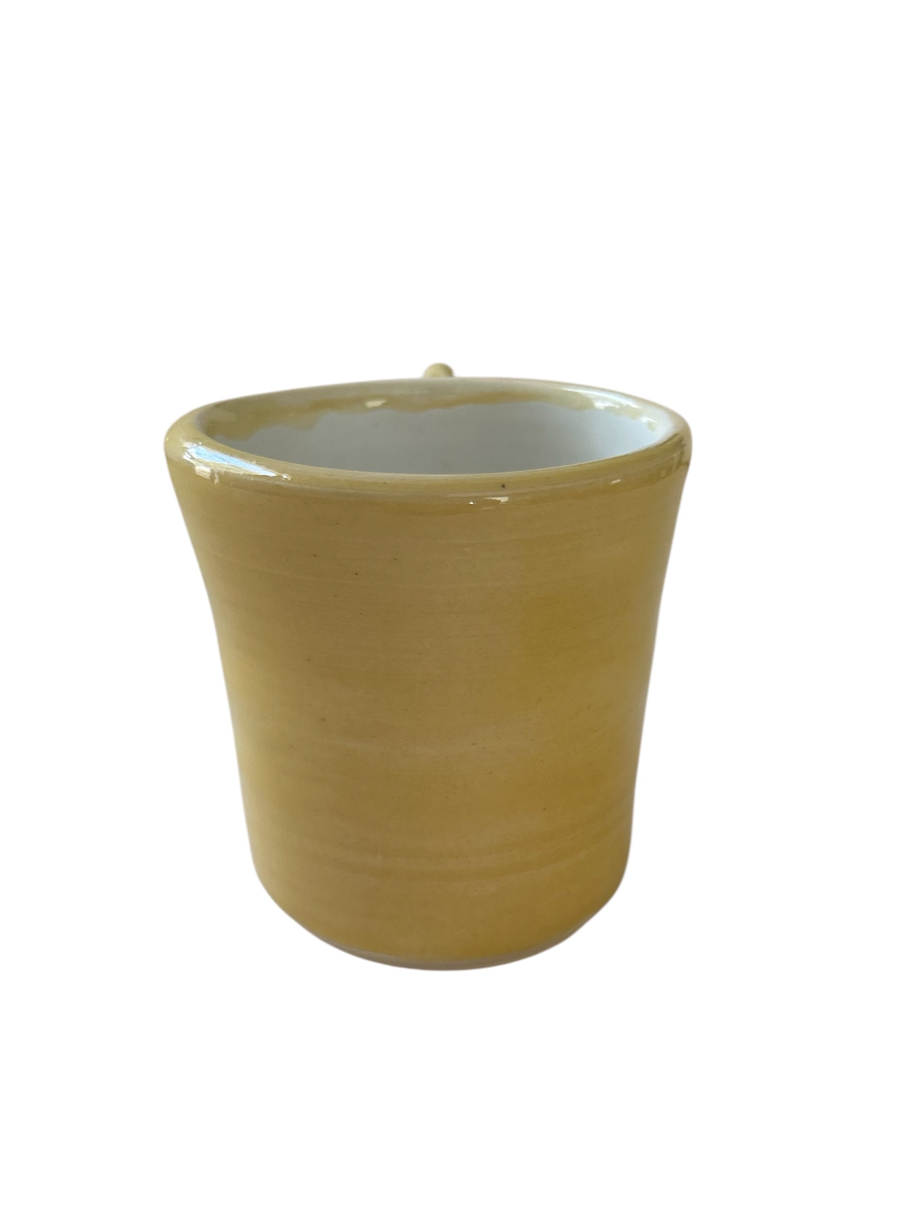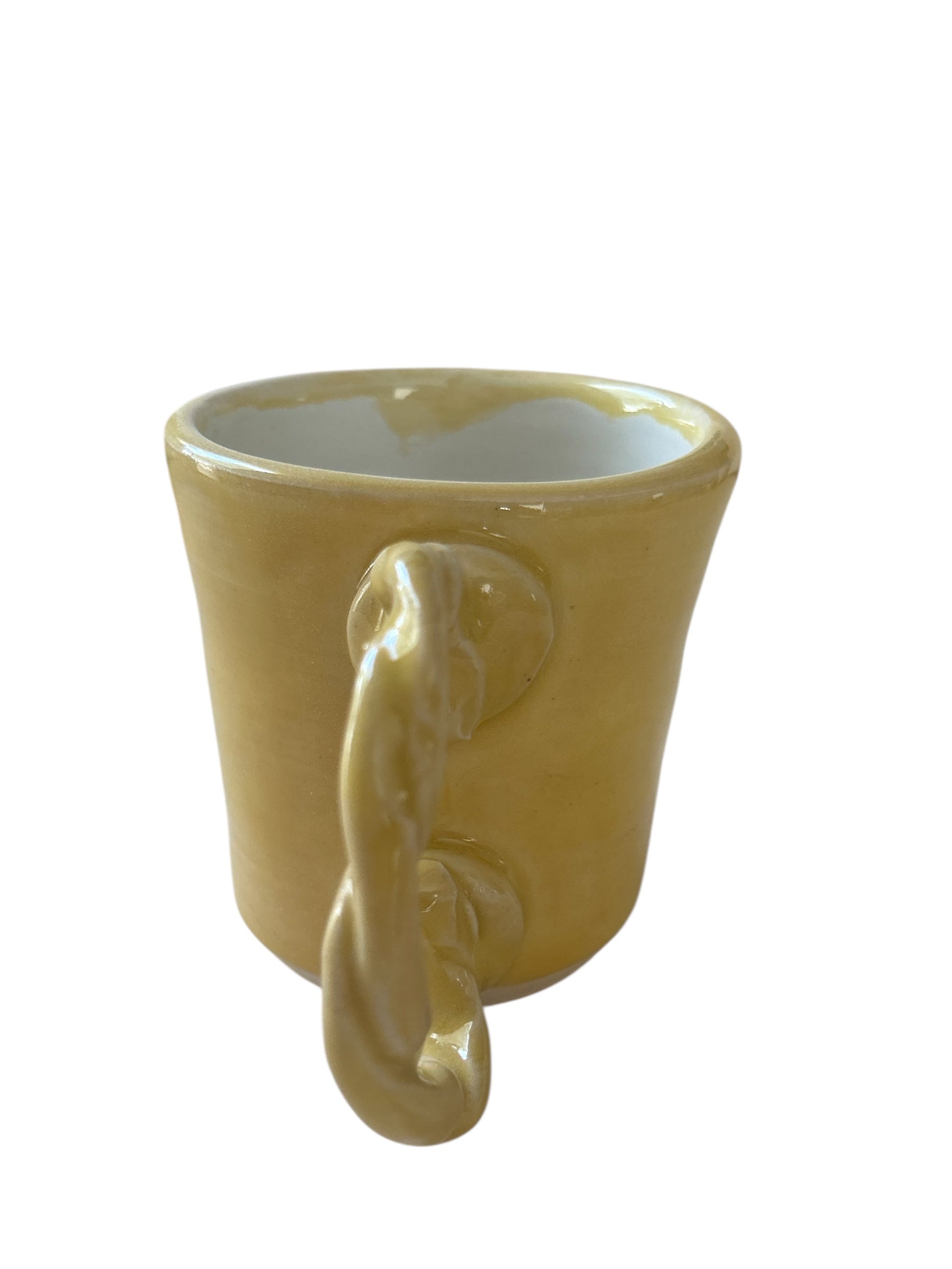 Wheel-thrown mug in marigold yellow with twisted coil handle.