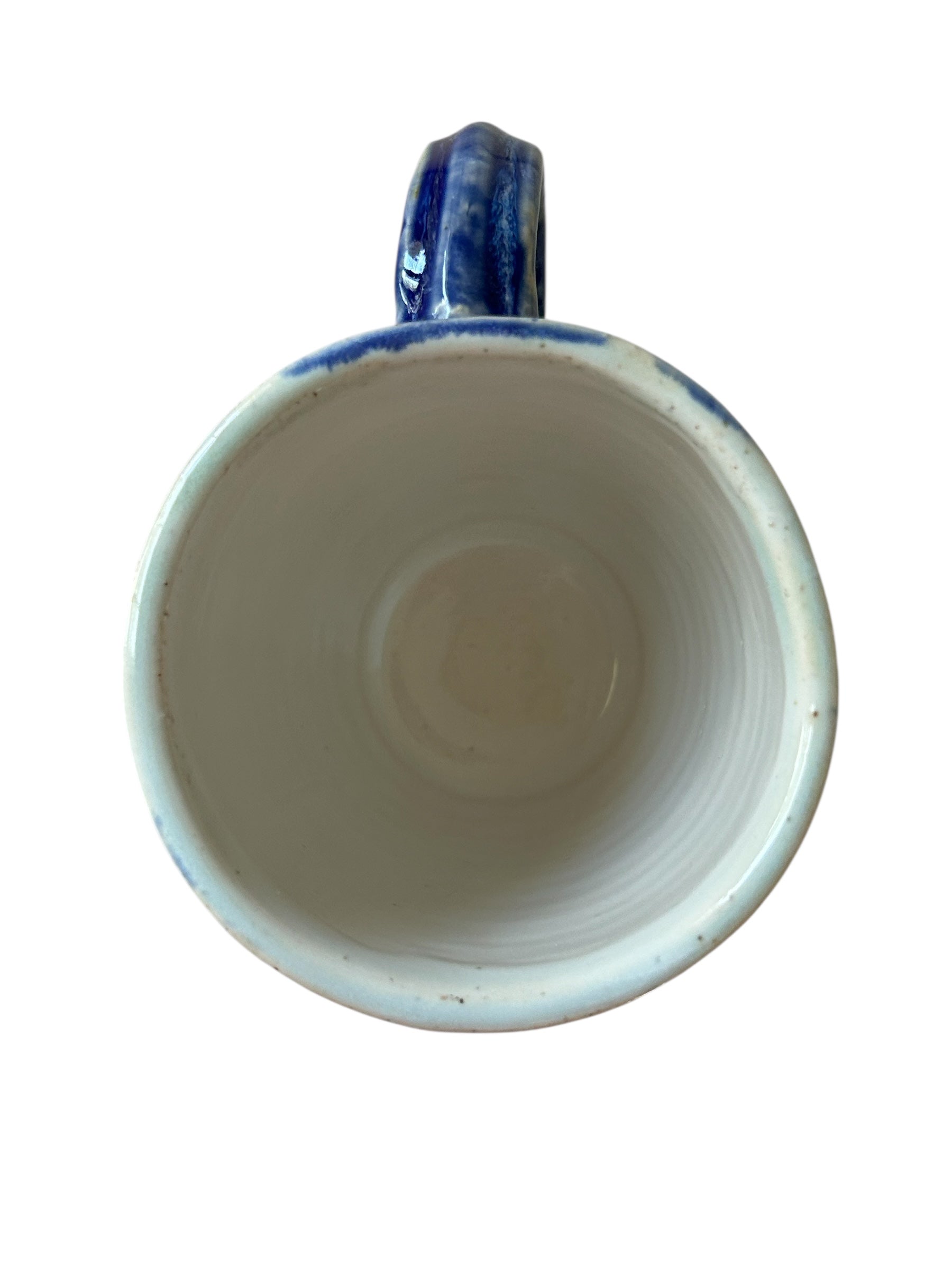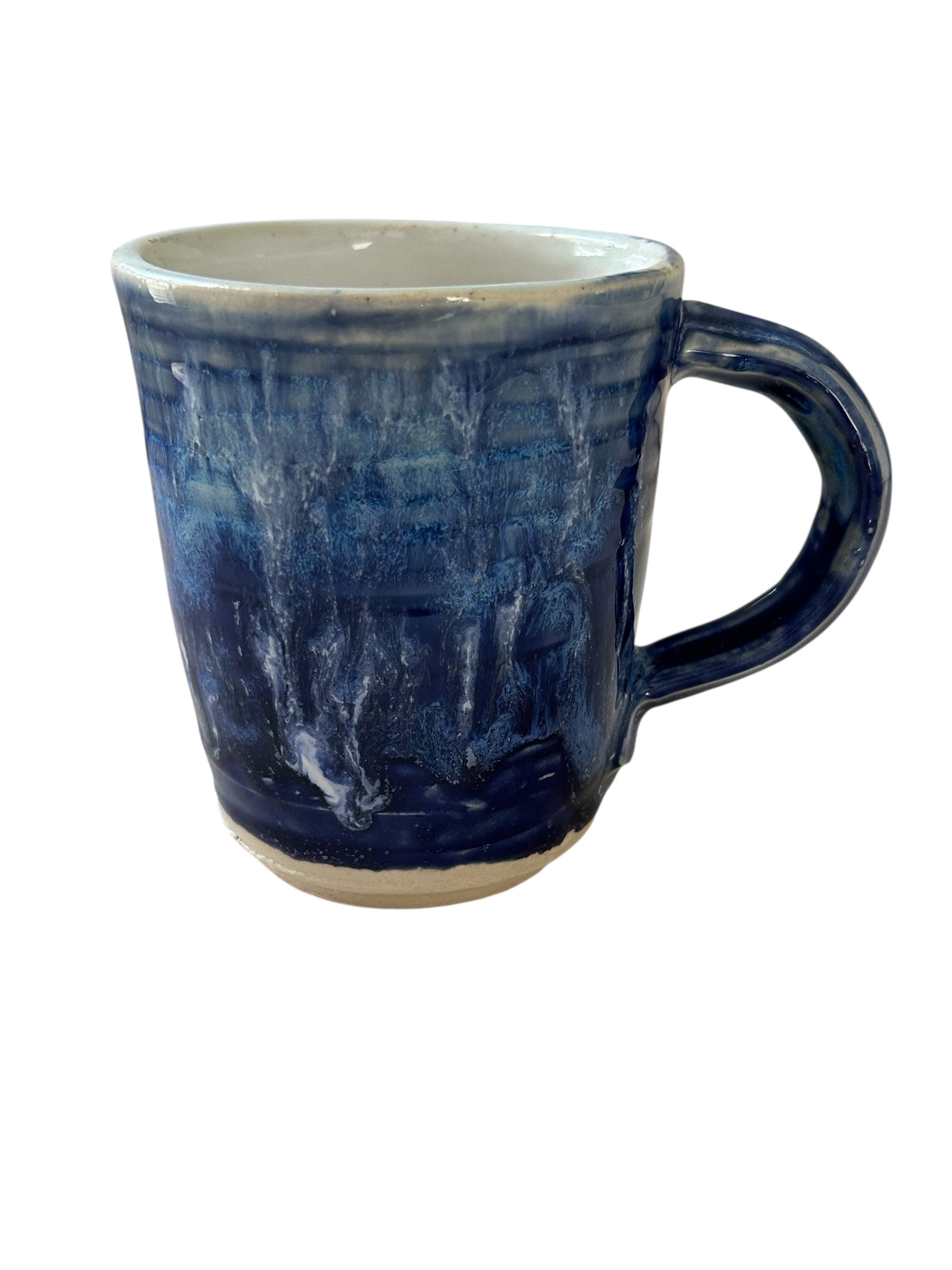 Small wheel-thrown mug in deep blue purple and snowy white, reminiscent of Colorado's Rocky Mountains, especially at night.
