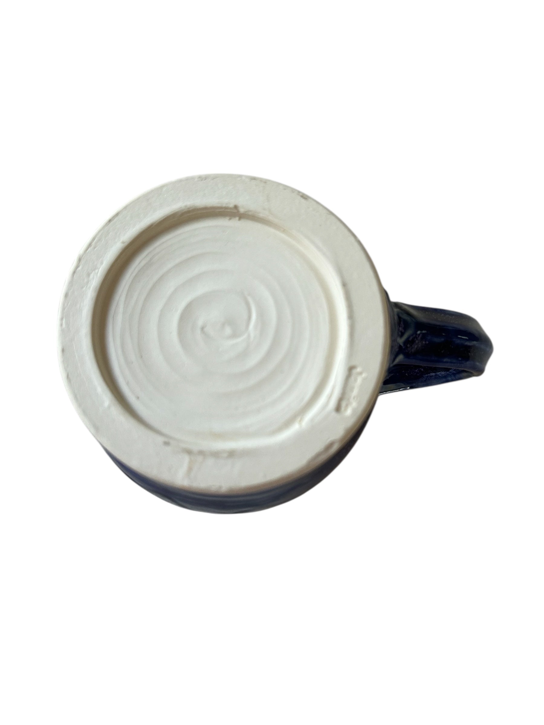 Wheel-thrown mug with thumb rest in deep blue purple and snowy white, reminiscent of Colorado's Rocky Mountains at night.